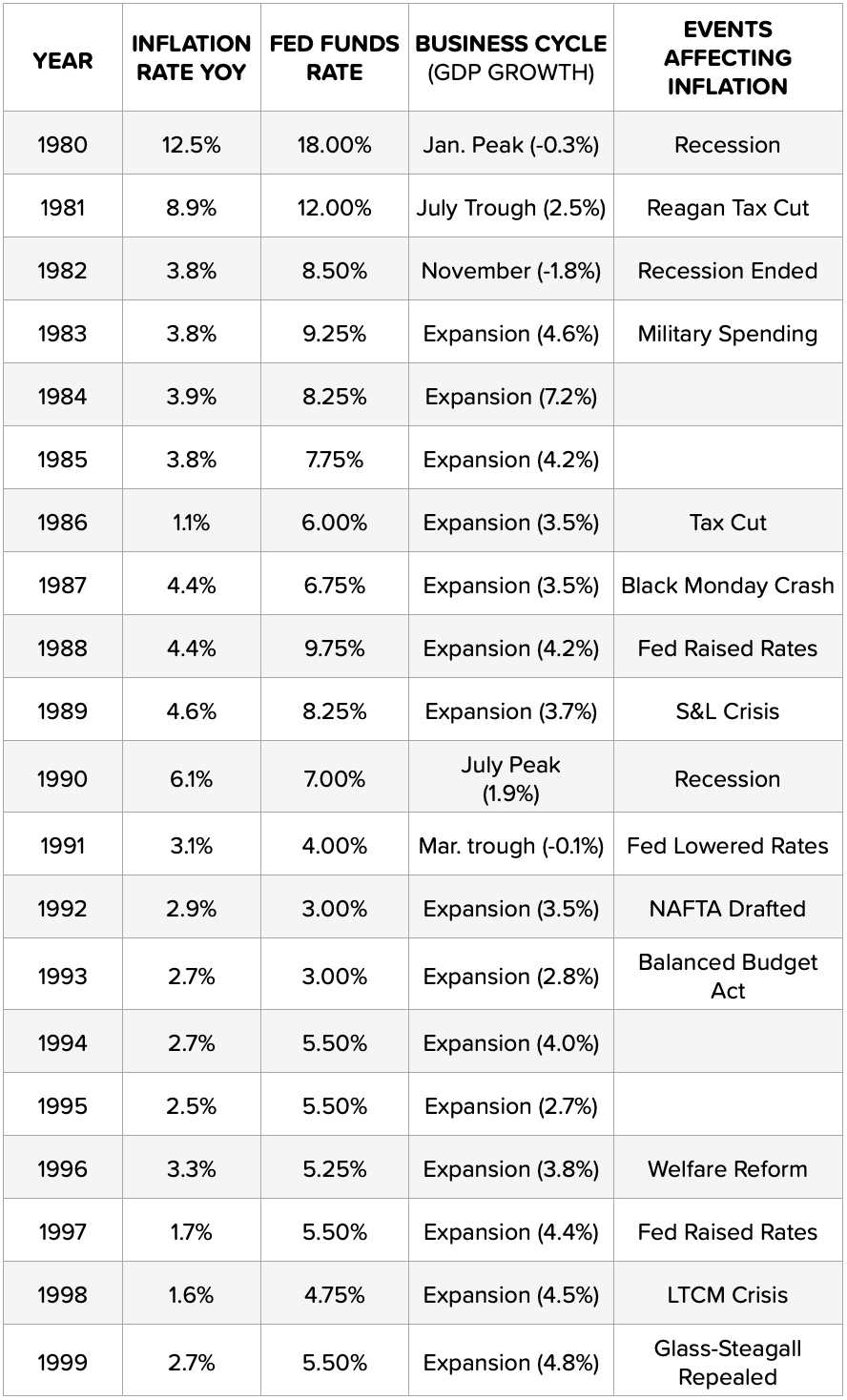 The table below compares the inflation rate (December end-of-year) with the fed funds rate, the phase of the business cycle, and the significant events influencing inflation.
